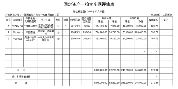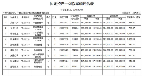 按照寧夏國投集團公司公務用車處置工作方案,北京國融興華資產(chǎn)評估有限公司依規(guī)對集團公司公務用車以2018年10月31日為基準日進行了評估。根據(jù)國有資產(chǎn)管理相關(guān)規(guī)定和自治區(qū)國有資產(chǎn)監(jiān)督管理委員會相關(guān)要求,現(xiàn)將公務用車評估結(jié)果予以公示。