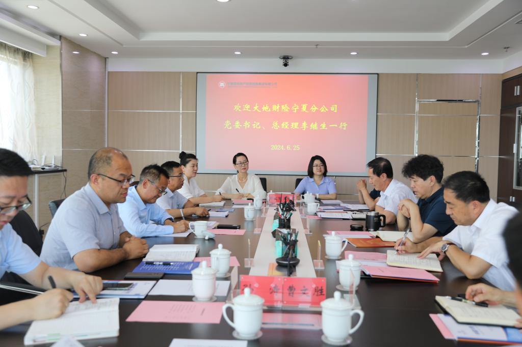 2024年6月25日,集團(tuán)公司黨委書記、董事長楊舵與來訪的大地財(cái)險(xiǎn)寧夏分公司黨委書記、總經(jīng)理李繼生一行座談,雙方就業(yè)務(wù)合作進(jìn)行了深入交流,集團(tuán)公司黨委副書記、工會主席郭聿維、高級經(jīng)理張宗文、大地財(cái)險(xiǎn)寧夏分公司副總經(jīng)理宋軍參加座談。