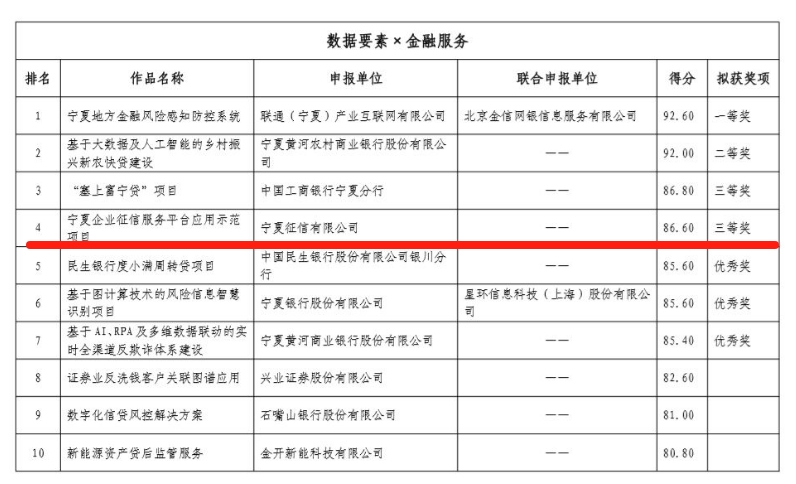 近期,由國家數(shù)據(jù)局、自治區(qū)人民政府指導(dǎo),自治區(qū)發(fā)展改革委(數(shù)據(jù)局)、自治區(qū)數(shù)據(jù)中心共同主辦的2024年“數(shù)據(jù)要素×”大賽寧夏區(qū)分賽,吸引超過千人報(bào)名參賽,參賽作品涵蓋工業(yè)制造、現(xiàn)代農(nóng)業(yè)、金融服務(wù)等6個(gè)行業(yè)賽道和1個(gè)通用賽道,經(jīng)過初賽、技術(shù)驗(yàn)證、決賽等環(huán)節(jié),寧夏征信公司(寧夏國投集團(tuán)下屬企業(yè))報(bào)送的參賽作品“寧夏企業(yè)征信服務(wù)平臺(tái)應(yīng)用示范項(xiàng)目”從280多個(gè)參賽作品中脫穎而出,最終在以銀行、證券等金融機(jī)構(gòu)為主的金融服務(wù)賽道獲得了寧夏賽區(qū)決賽三等獎(jiǎng)的好成績,評(píng)審組專家一致認(rèn)為該項(xiàng)目具有可復(fù)制、可推廣運(yùn)用的重要價(jià)值。