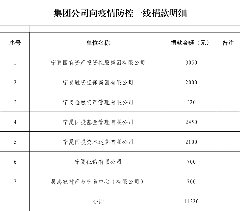 “9·20”疫情發(fā)生以來,集團(tuán)公司迅速行動(dòng),組織黨員、團(tuán)員和青年職工充實(shí)到黨員先鋒隊(duì)、疫情防控志愿者服務(wù)隊(duì)中來,積極開展疫情防控志愿服務(wù),體現(xiàn)了寧夏國(guó)投人的勇氣與擔(dān)當(dāng)。為進(jìn)一步助力疫情防控,集團(tuán)公司及各子公司人員紛紛伸出援手,匯聚愛心、凝聚力量,短時(shí)間內(nèi)籌集捐款11320元并向?qū)幭那嗌倌臧l(fā)展基金會(huì)進(jìn)行捐贈(zèng),用于一線疫情防控。下一步,寧夏國(guó)投集團(tuán)將繼續(xù)落實(shí)疫情防控有關(guān)要求,踐行國(guó)企使命擔(dān)當(dāng),為疫情防控貢獻(xiàn)國(guó)企力量。