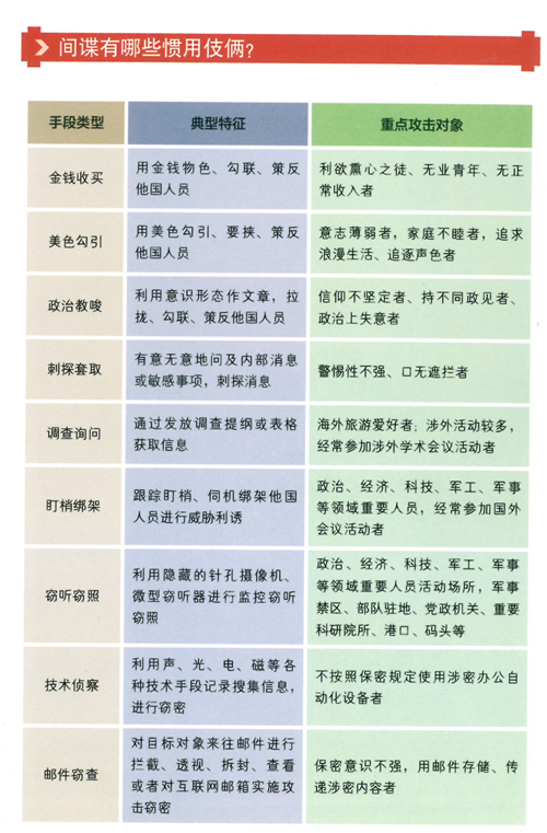 5.若遇到誘騙或策反參加間諜組織,應(yīng)“不理睬、不答復(fù)、不上當(dāng)”,并及時(shí)向國(guó)家安全機(jī)關(guān)、公安機(jī)、所在單位報(bào)告。