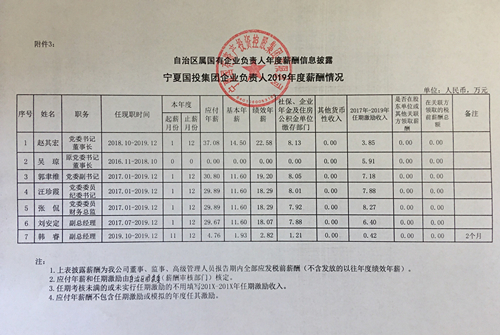 寧夏國投集團(tuán)企業(yè)負(fù)責(zé)人2019年度薪酬情況