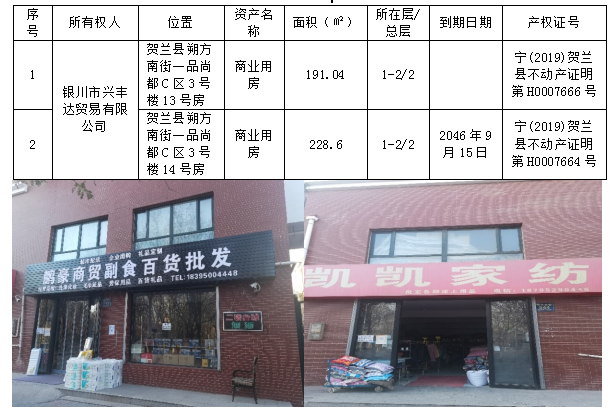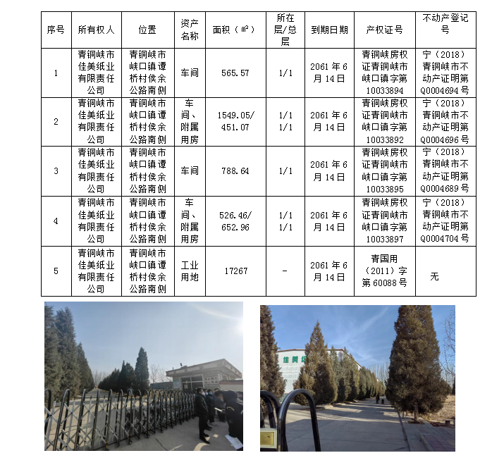 該戶債權(quán)項下位于賀蘭縣朔方南街一品尚都的抵押物,周圍商業(yè)氛圍較好,目前兩套房產(chǎn)均有承租人;青銅峽市峽口鎮(zhèn)談橋村的土地和車間位于青銅峽市峽口鎮(zhèn)譚橋村侯余公路南側(cè),即青銅峽市佳美紙業(yè)有限責任公司廠區(qū),目前因債務(wù)人資金短缺,暫時處于停產(chǎn)、關(guān)閉狀態(tài)。