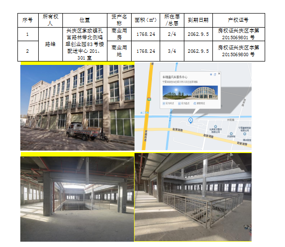 該抵押物為興慶區(qū)掌政鎮(zhèn)孔富路林帶北側(cè)鳴翠創(chuàng)業(yè)園83號樓配送中心201、301室,面積合計3536.48平方米。周邊原計劃建設(shè)物流園區(qū),該抵押物為園區(qū)配套設(shè)施,目前處于空置狀態(tài)。抵押物現(xiàn)已達到3通一平,外立面完整,內(nèi)部未裝修。可用于電商、倉儲、辦公等。該房屋1樓已出租用于簡單的汽車修理和雜物倉庫。