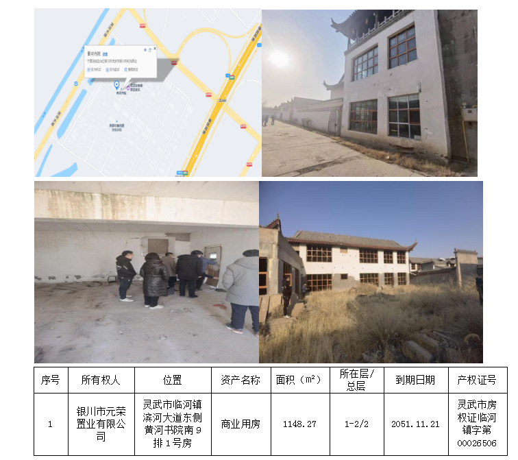 抵押物為靈武市臨河鎮(zhèn)濱河大道東側(cè)黃河書院南9排1號房(實際位置為由向東第三棟),面積1148.27平方米,由銀川市元榮置業(yè)保管?!包S河書院”位于靈武黃河岸邊,離銀川十幾公里,距離銀川河?xùn)|國際機場約3公里。