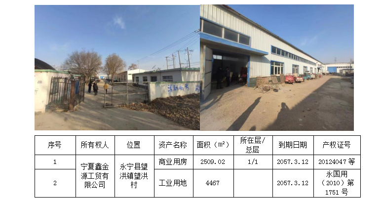 抵押物為寧夏鑫金源工貿(mào)公司名下位于永寧縣望洪鎮(zhèn)望洪村的工業(yè)用地和廠房,總建筑面積2509.02平米,占地面積4467平米,目前部分處于租賃狀態(tài),作為倉儲(chǔ)使用。