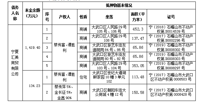 2022年12月28日,寧夏金融資產(chǎn)管理有限公司收購石嘴山銀行持有的寧夏匯美商貿(mào)有限公司6筆不良債權(quán)。第一筆債權(quán)原貸金額為650萬元,截至2022年10月31日(基準(zhǔn)日),未償本金0萬元,未嘗利息90.82萬元,未償本息合計(jì)90.82萬元;第二筆債權(quán)原貸金額為650萬元,截至2022年10月31日(基準(zhǔn)日),未償本金0萬元,未嘗利息124.98萬元,未償本息合計(jì)124.98萬元;第三筆債權(quán)原貸金額為158萬元,截至2022年10月31日(基準(zhǔn)日),未償本金0萬元,未嘗利息5.16萬元,未償本息合計(jì)5.16萬元;第四筆債權(quán)原貸金額為620萬元,截至2022年10月31日(基準(zhǔn)日),未償本金0萬元,未嘗利息21.20萬元,未償本息合計(jì)21.20萬元;第五筆債權(quán)原貸金額為1428萬元,截至2022年10月31日(基準(zhǔn)日),未償本金1,419.40萬元,未嘗利息224.69萬元,未償本息合計(jì)1,644.09萬元;第六筆債權(quán)原貸金額為147萬元,截至2022年10月31日(基準(zhǔn)日),未償本金134.23萬元,未嘗利息26.17萬元,未償本息合計(jì)160.40萬元(基準(zhǔn)日之后的利息也在本次處置范圍之內(nèi))。