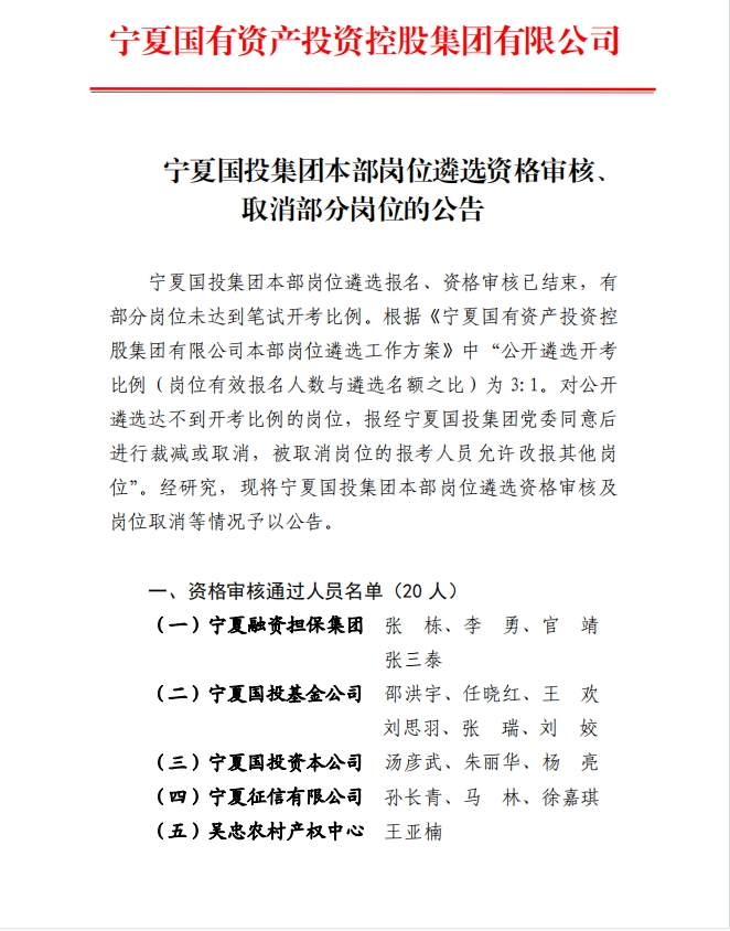 寧夏國投集團(tuán)本部崗位遴選資格審核取消部分崗位的公告