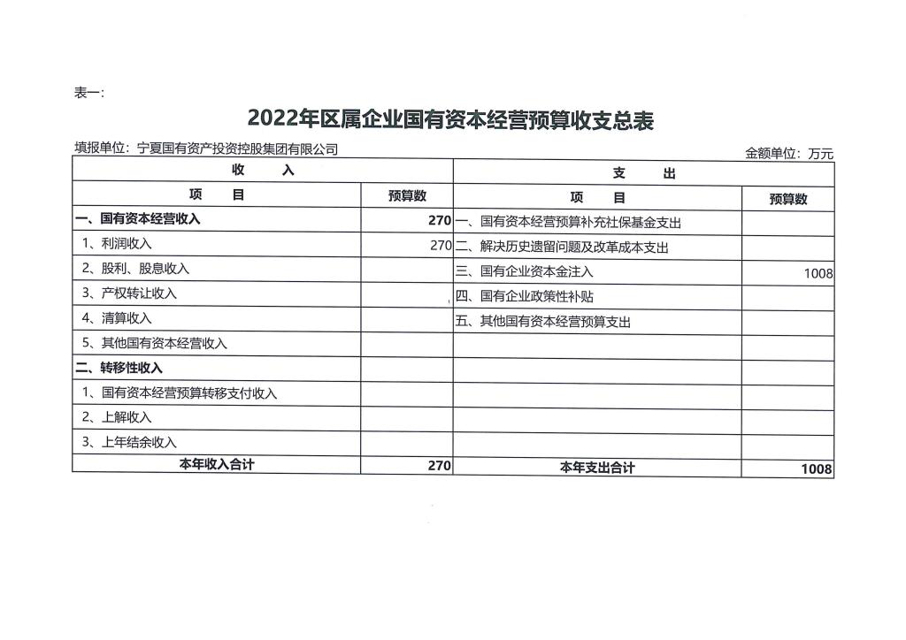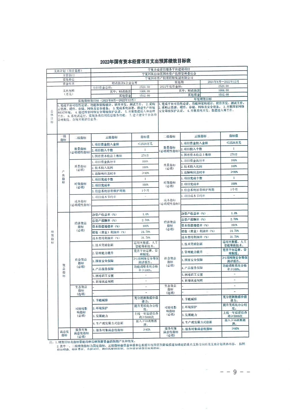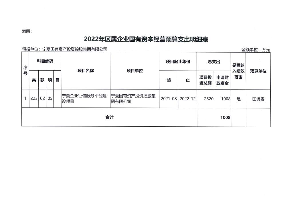按照《自治區(qū)國資委關(guān)于批復(fù)2022年國有資本經(jīng)營預(yù)算和項目支出預(yù)算績效目標(biāo)的通知》(寧國資函〔2022〕3號)要求,寧夏國有資產(chǎn)投資控股集團(tuán)有限公司國有資本支出項目為《寧夏企業(yè)征信服務(wù)平臺建設(shè)項目》,項目總投資額2520萬元,其中財政撥款1008萬元?,F(xiàn)將《2022年國有資本經(jīng)營項目支出預(yù)算績效目標(biāo)表》予以公示。