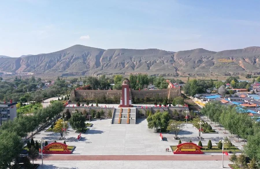 這是位于寧夏固原市西吉縣的將臺堡紅軍長征會師紀念園(2021年10月18日攝,無人機照片)。新華社記者 盧鷹 攝