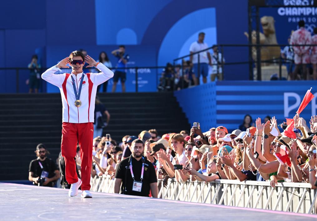 ??巴黎奧運會跳水男子雙人三米板金牌得主、中國選手龍道一在法國巴黎冠軍公園與觀眾互動(2024年8月5日攝)。新華社記者 賀燦鈴 攝