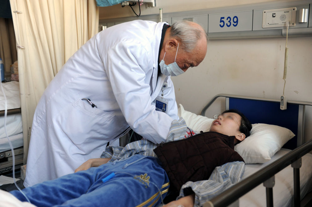 ??瑞金醫(yī)院終身教授王振義在上海瑞金醫(yī)院為病人看?。ㄙY料照片)。新華社發(fā)