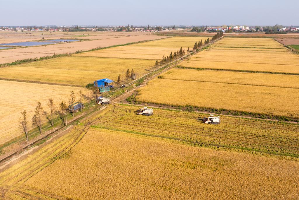 ??在湖南省岳陽市華容縣團洲垸,村民駕駛收割機收獲水稻(2024年11月1日攝,無人機照片)。新華社記者 陳思汗 攝