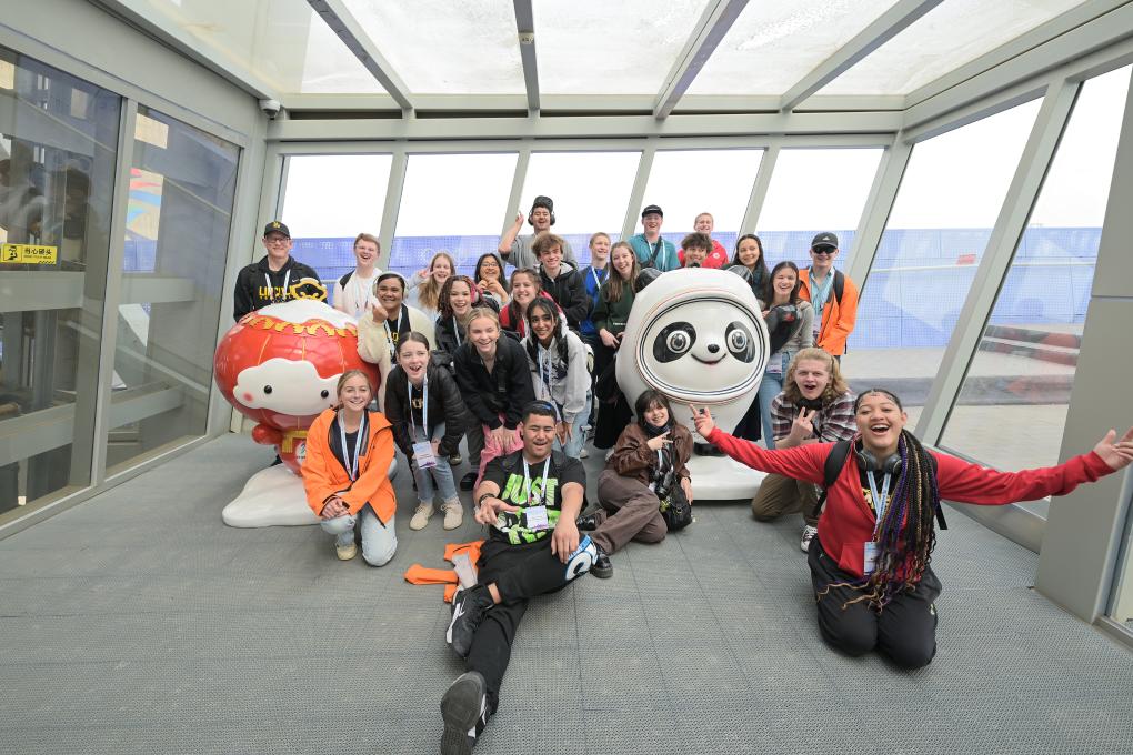 2024年3月21日,美國華盛頓州中學生代表團的成員在首鋼滑雪大跳臺上與冰墩墩、雪容融合影。新華社記者 李鑫 攝
