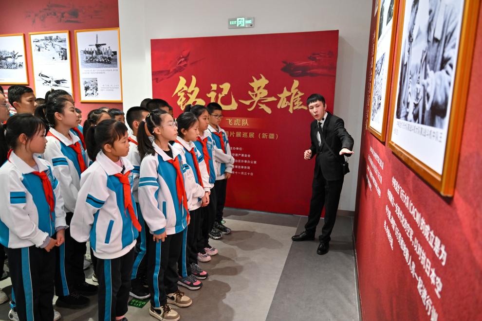 2024年11月30日,烏魯木齊八一中學的學生在觀看“銘記英雄——飛虎隊主題歷史圖片展巡展(新疆)”。新華社記者 丁磊 攝