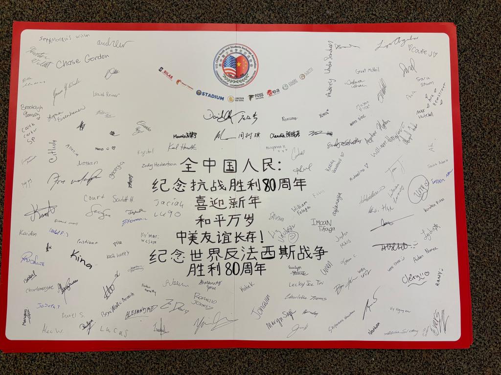 ??此前,美國華盛頓州美中青少年學生交流協(xié)會和林肯中學、體育場中學曾參加“5年5萬”倡議訪華的師生代表向習近平主席夫婦和全中國人民致新年賀卡?!跋灿履?,和平萬歲,中美友誼長存!”賀卡上寫滿了百余個簽名,一些簽名旁還畫著愛心、笑臉。