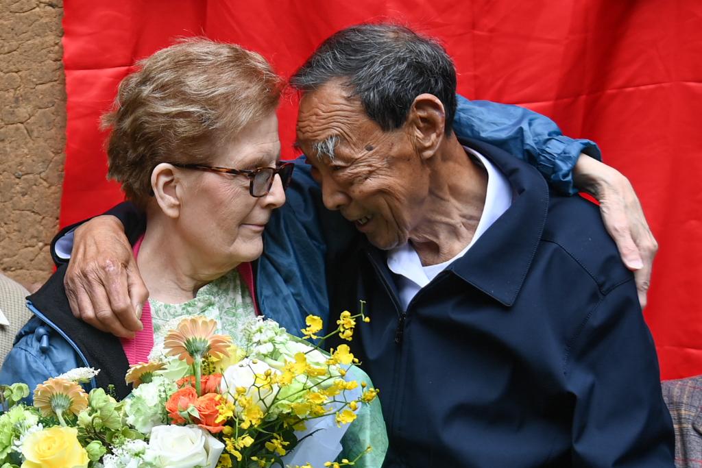 2024年4月17日,在浙江衢州江山市張村鄉(xiāng)龍頭店村,“杜立特行動”3號機領航員查爾斯·奧祖克的女兒蘇珊·奧祖克(左)與村民廖明發(fā)相擁。1942年,村民廖詩原(廖明發(fā)的父親)一家曾悉心照顧跳傘降落的查爾斯·奧祖克。新華社記者 黃宗治 攝