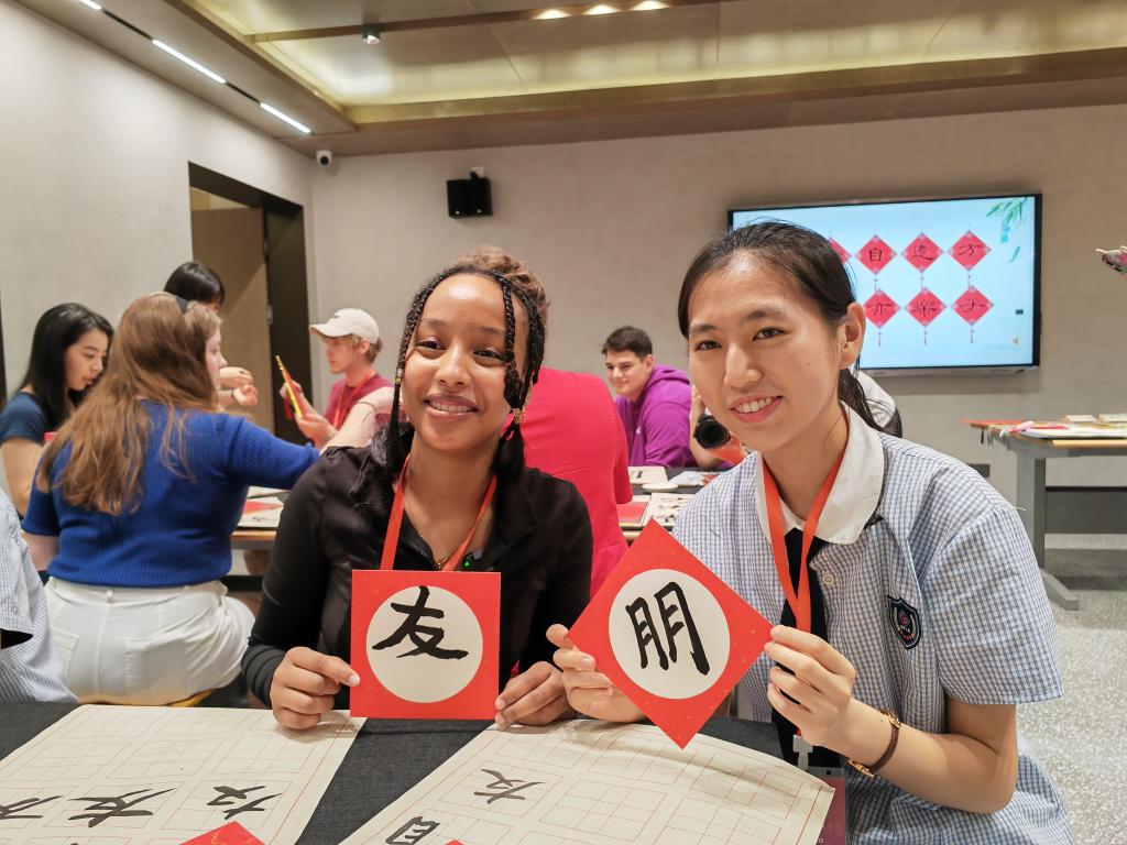 2024年6月8日,在河北省石家莊外國語學校,美國山谷高中學生娜斯拉(左一)在上漢字書法課。新華社記者 杜一方 攝
