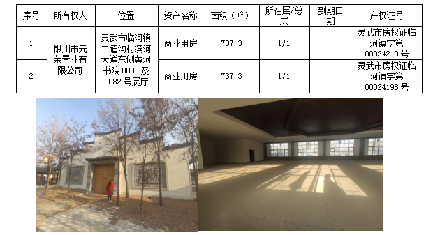 該戶債權(quán)抵押物位于靈武市臨河鎮(zhèn)濱河大道東側(cè)黃河書(shū)院內(nèi)0080號(hào)和0082號(hào)展廳,面積共計(jì)1474.6平方米。抵押物房屋戶型良好,寬敞明亮,有部分基礎(chǔ)裝修。該地理位置交通便利,距離銀川河?xùn)|國(guó)際機(jī)場(chǎng)約3公里。黃河書(shū)院集“文化傳播、學(xué)習(xí)靜修”為一體,環(huán)境優(yōu)美宜人,遠(yuǎn)離鬧市喧囂,適合經(jīng)營(yíng)飯店、旅游展廳等。